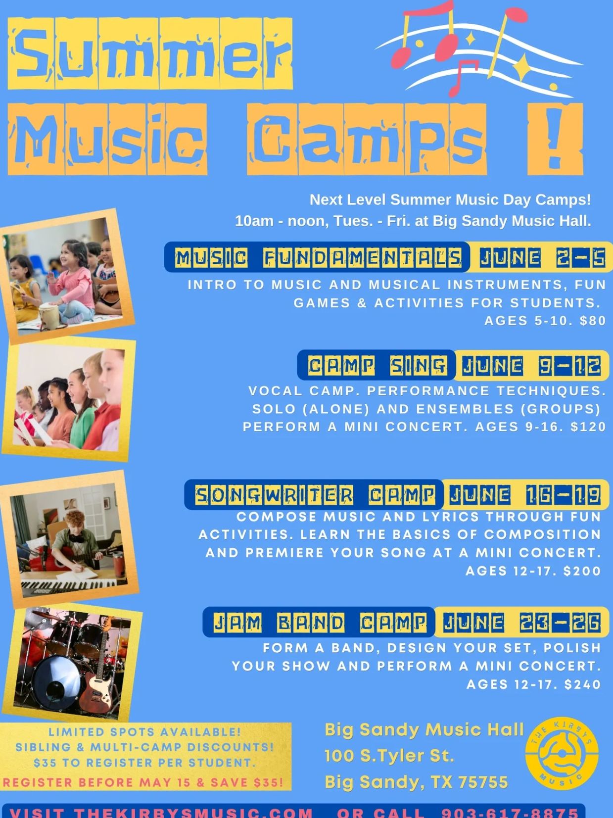 All camps are from 10am until 12noon, Tuesday through Friday at Big Sandy Music Hall.